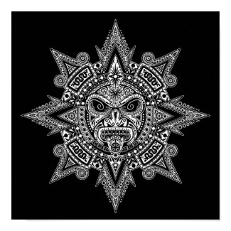 "This Aztec inspired sun design has eight intricate rays that stretch out from the center of the pattern. The menacing mask at the center of the design has its eyes locked forward and tongue stretched out of its tooth filled mouth. Two-headed serpents sit inside of stylized rectangles on the four corners of the outer circle. This aggressive design is a striking homage to the beauty and mystery of Aztec art."